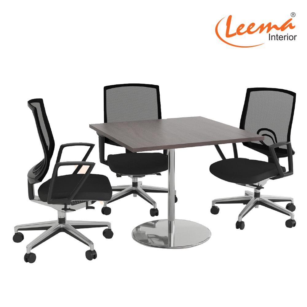 Small meeting table comprising of 25 mm melamine laminated particle board top finished with 2 mm thick PVC edging. Top supported with 50 mm dia chrome plated or powder coated metal tube with base plate