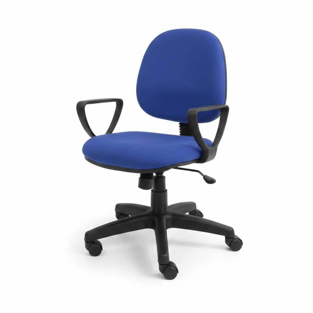 Fabric upholstered task chair with polypropylene armrest, having 5 prong nylon base, twin caster nylon wheels and height adjustable mechanism.